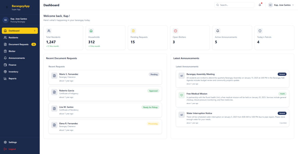 A community focused system designed to support barangay level coordination and public service management. It centralizes resident records, requests, announcements, and administrative activities into a single platform.