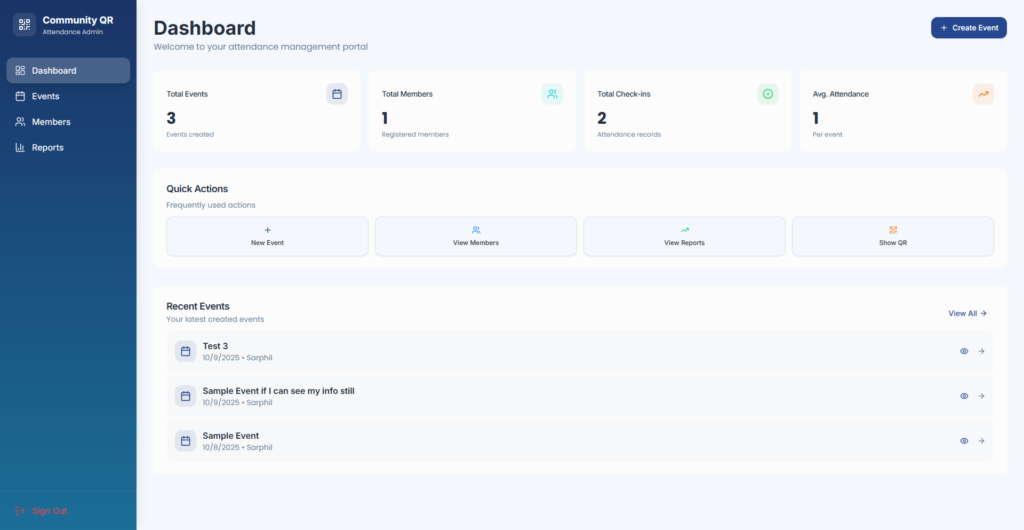 A QR based attendance system designed for community events, facilities, and organized gatherings. It provides a structured way to record participation and access without manual sign in sheets.