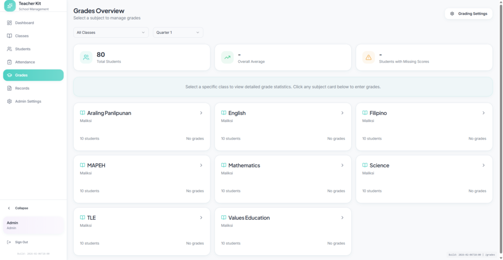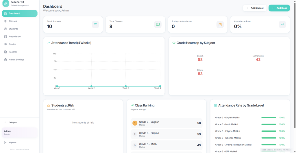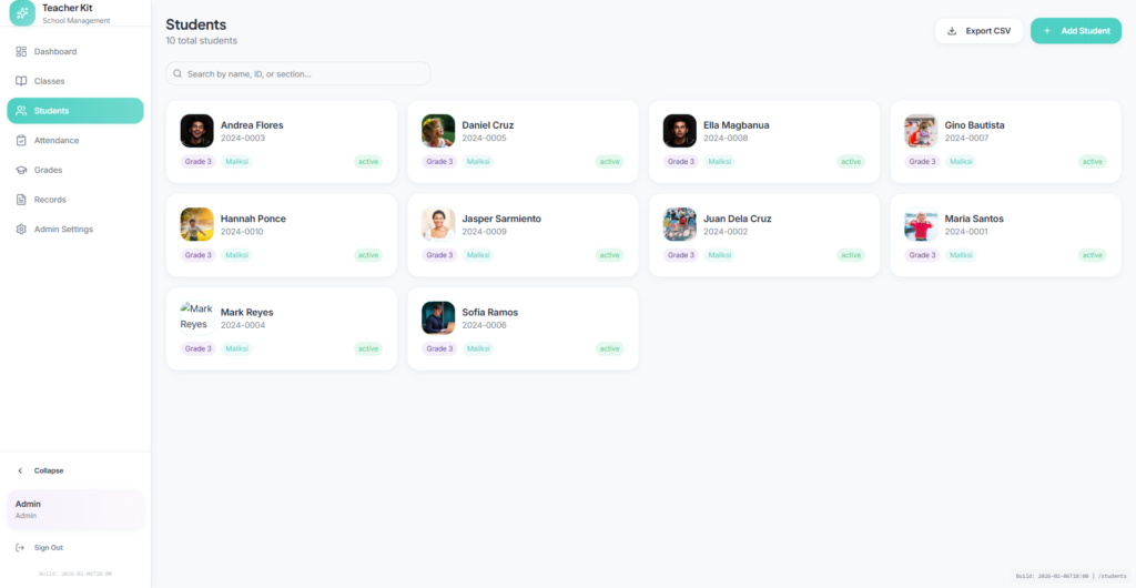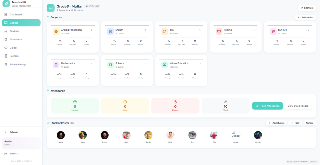Teachers Kit is designed to support the everyday reality of teaching and school administration. It centralizes student information, class structures, and basic academic records so educators are not switching between notebooks, spreadsheets, and disconnected tools.