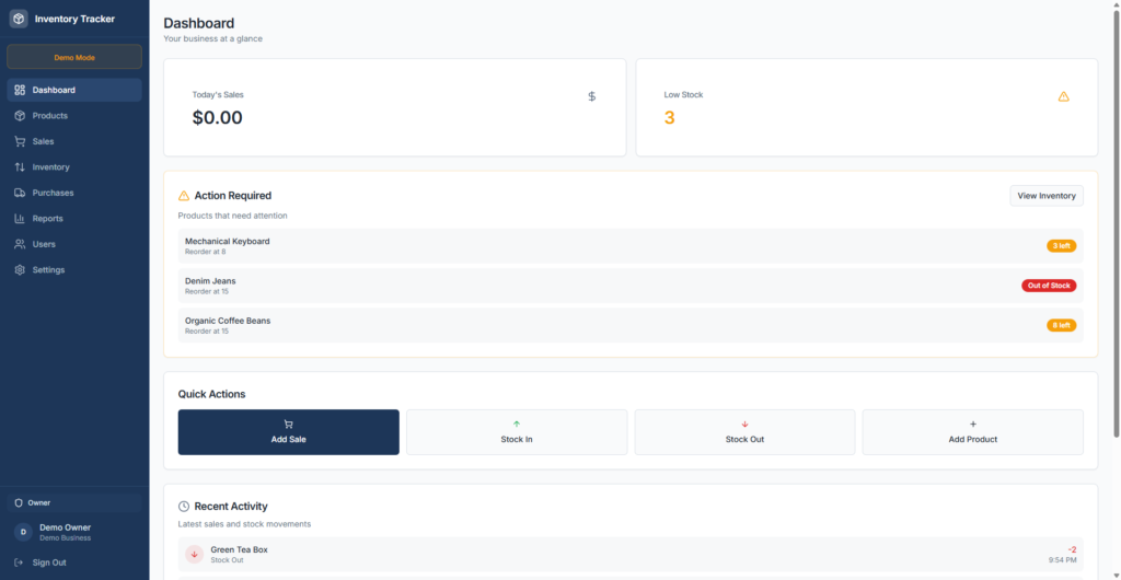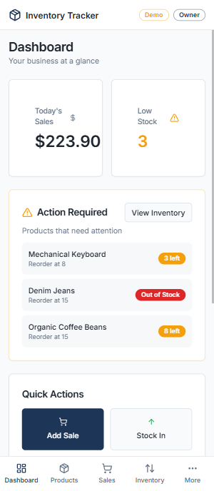 Unlike warehouse focused tools, this system is built around selling. The interface prioritizes speed at the counter while still maintaining accurate records in the background. Inventory visibility is continuous throughout the day, not something reviewed only after closing.