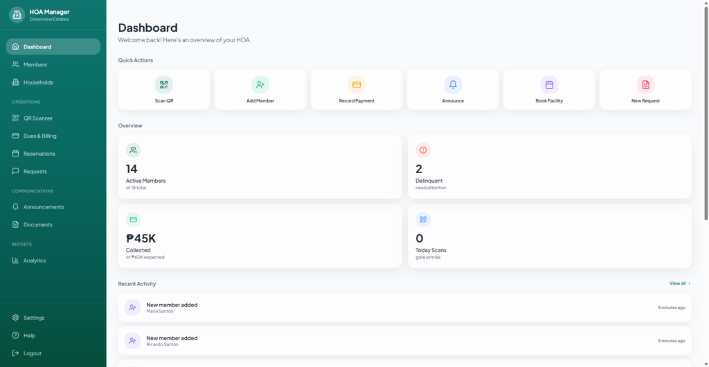 A system built to support the operational needs of homeowners associations. It organizes member records, dues, announcements, and administrative tracking into a single working platform. Designed for associations that manage shared facilities, recurring fees, and community level coordination.